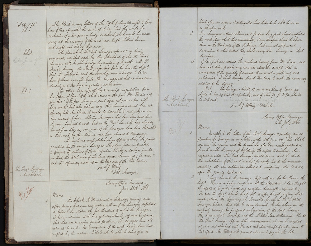 Below are some sample pages from the outward letter book of the Tauranga Survey Office, 1866-1868, Te Ao Mārama - Tauranga City Libraries Ms 18