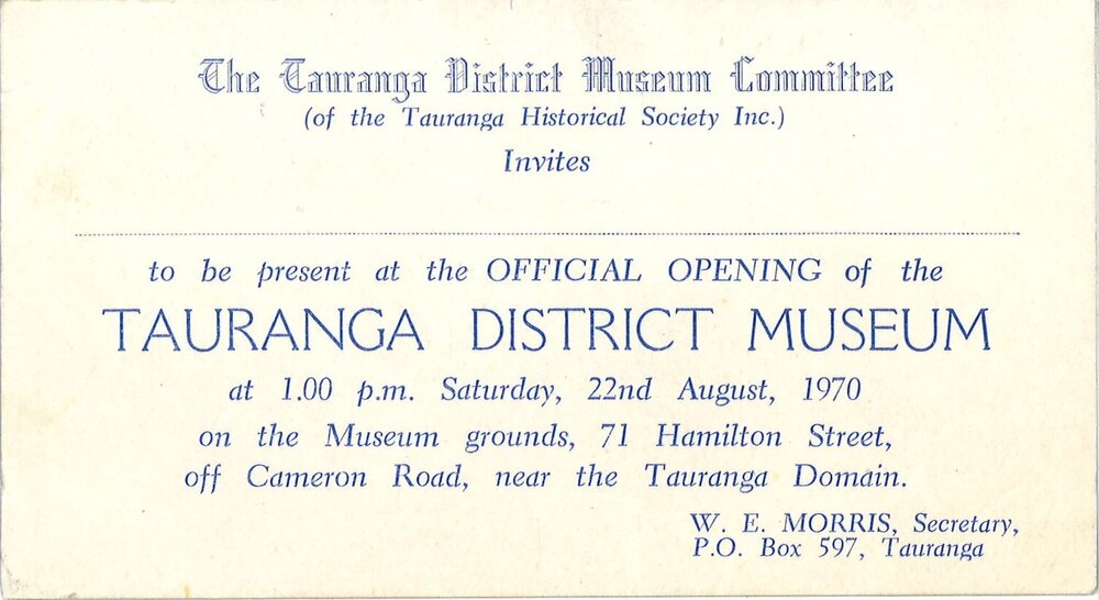 Tauranga Historical Society, Invitation to the official opening of the Tauranga District Museum, 22 Aug 1970 (22 August 1970). Pae Korokī, accessed 06/04/2026, https://paekoroki.tauranga.govt.nz/nodes/view/119703