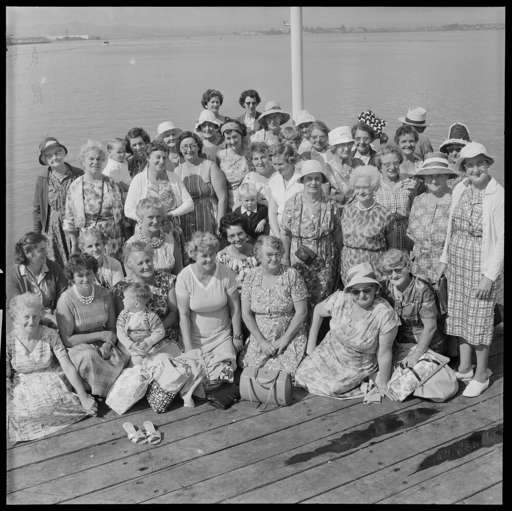 CWI members picnic party at Mount Maunganui Wharf, heading for Ōmokoroa, February 1965.