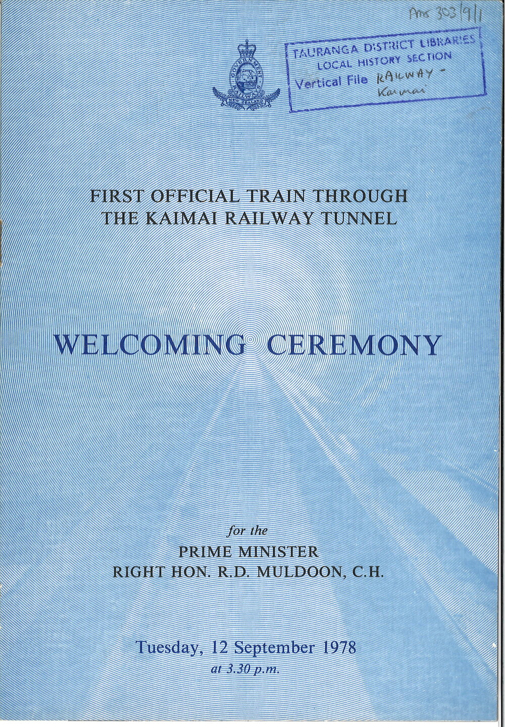 New Zealand Railways. Publicity and Advertising Branch, Welcoming ceremony programme for the first official train through the Kaimai Railway Tunnel (12 September 1978). Pae Korokī, accessed 18/03/2026, https://paekoroki.tauranga.govt.nz/nodes/view/120043