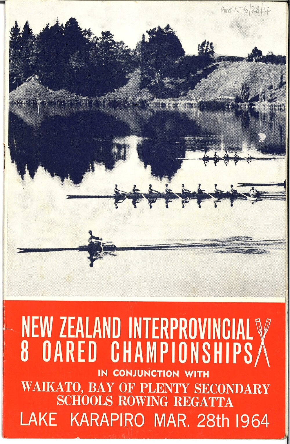 Programme for New Zealand Interprovincial 8 Oared Championships in conjunction with Waikato, Bay of Plenty Secondary Schools Rowing Regatta, 28 Mar 1964