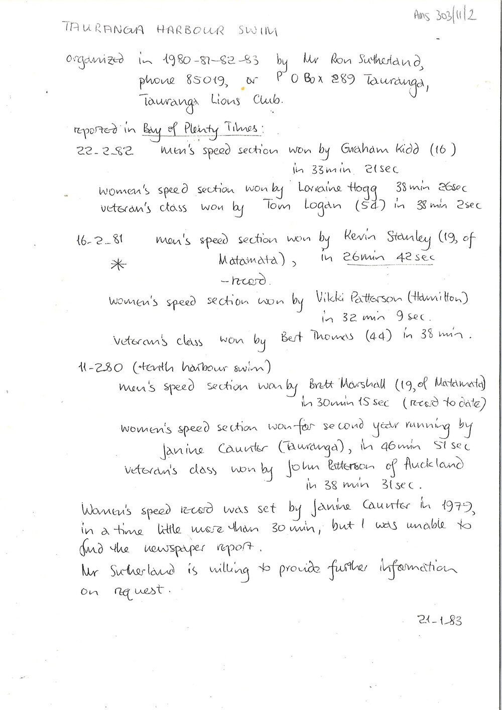 Photocopied notes on Tauranga Harbour Swim (21 January 1983). Pae Korokī, accessed 18/03/2026, https://paekoroki.tauranga.govt.nz/nodes/view/120080