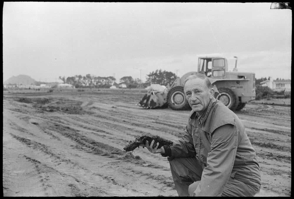 Golf course architect Mr H. P. Dale holds turf at construction of 18 hold Mount Maunganui golf course, eastern end of Tauranga Airport, June 1971.