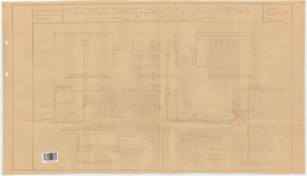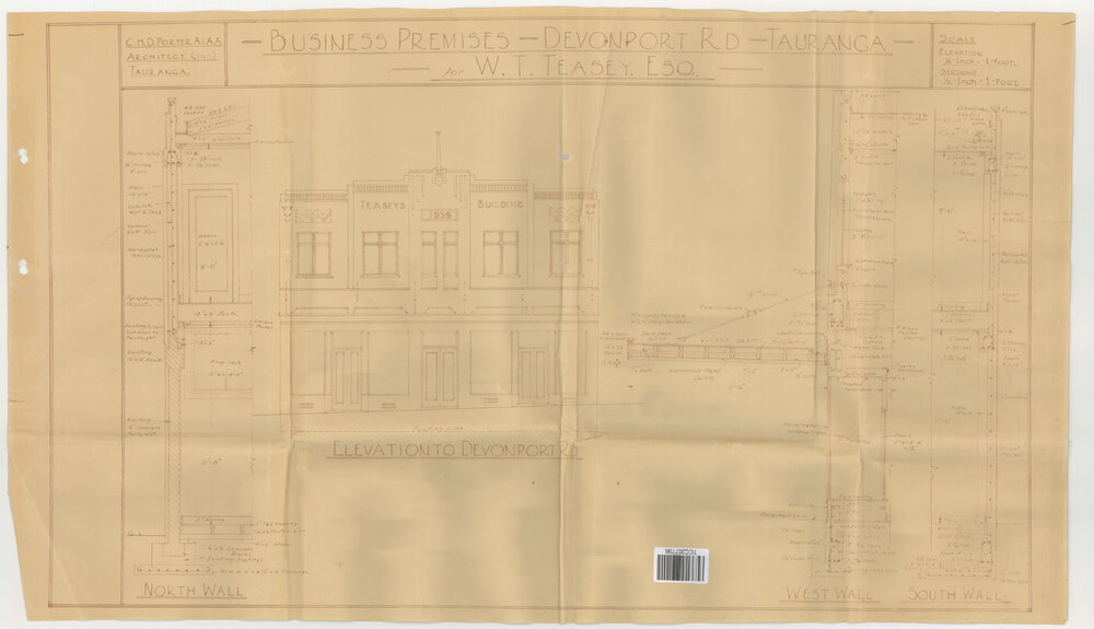 SummaryWilliam Thomas Teasey (1871-1950) built next to his son Harry's "Teasey's Garage" in 1939 on a site described as practically level but with "a rise of approximately 16 inches north to south" and containing a small Brick Office that would need removing beforehand. On the other side of the road had stood Teasey's "Progressive Building" since 1912. This building is a two-storey reinforced-concrete commercial building in the Art Deco style common between the World Wars. It had strong horizontal emphasis beneath a low-pitched roof, vertical linear detailing, rectangular patterning, chevron pediments, and a cantilevered street verandah suspended on wrought-iron ties with pressed-metal lining. When the building was first built it provided retail premises on the ground floor, offices upstairs including a room for a piano teacher, with some accommodation at the rear of the first floor. The Tauranga Rowing Club began with meetings in a shed at the back of Teasey’s building before they moved to more appropriate premises on the water’s edge