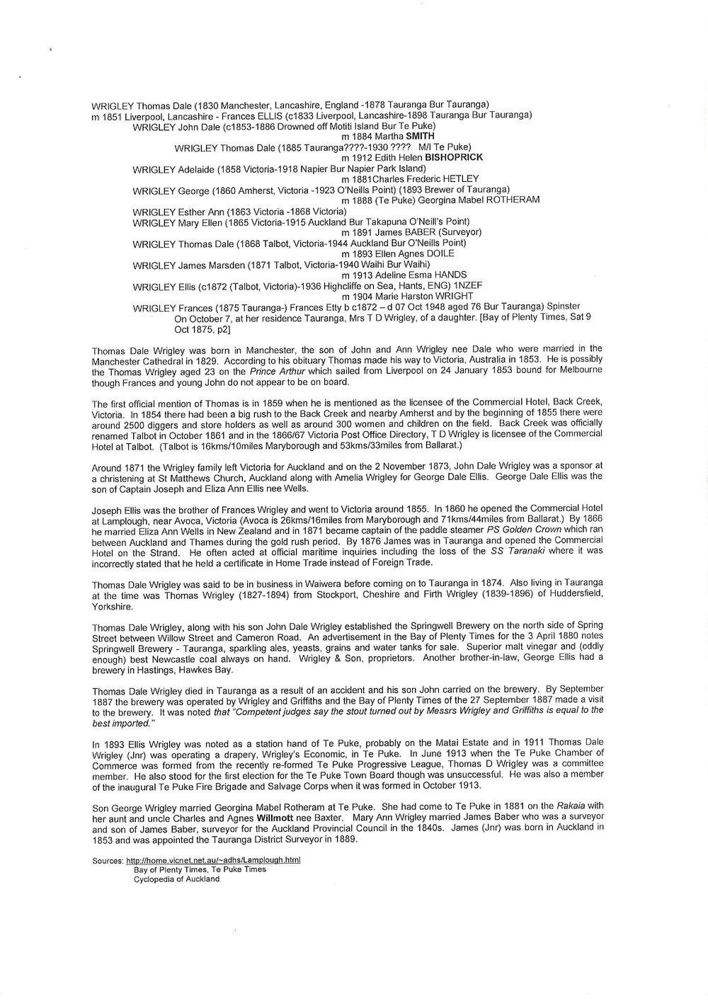 Thomas Dale Wrigley (1830–1878) – central figure; brewer, hotel proprietor, businessman; licensee of the Commercial Hotel (Back Creek/Talbot), co-founder of the Springwell Brewery in Tauranga, member of the Tauranga Town Board; migrated from England via Victoria to New Zealand.