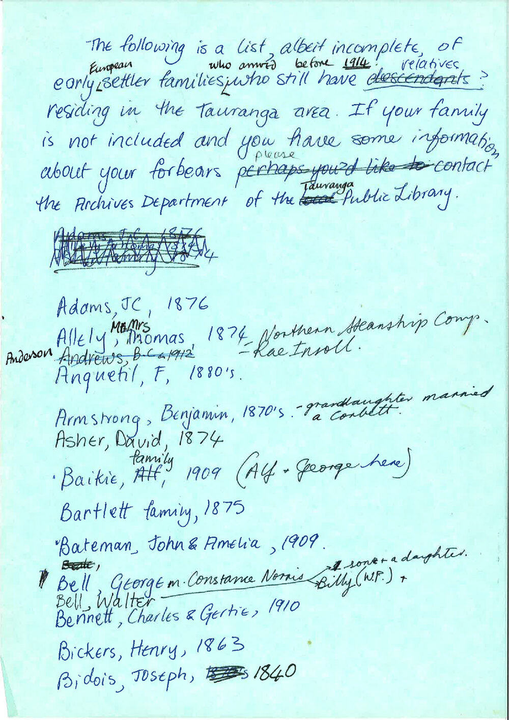 DescriptionHandwritten notes of early immigrant families to Tauranga within the former Vertical files in the New Zealand Room of the Tauranga Library