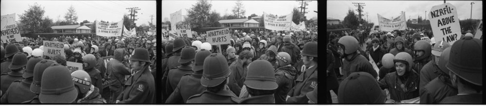 DateWednesday, 2 September 1981Reference NumberPhoto 16-148DescriptionThree digitised 35mm negative frames from the Gifford Cross Collection donated to the Tauranga Public Library in the 1980s. Dated September 2 1981 and part of a photo shoot that included many other images it was originally described as “Spring Box Protestor" and housed within an “Extras Sept 81” box. It depicts police and anti-apartheid protestors prior to the Bay of Plenty vs Springboks Rugby game held in Rotorua September 2 1981. Original negative set with Tauranga City Libraries Research Collections. FormatNegativePhysical Description35mm negative stripSource of AcquisitionGifford-Cross Donation, 1992Photographer/CreatorBay of Plenty Times