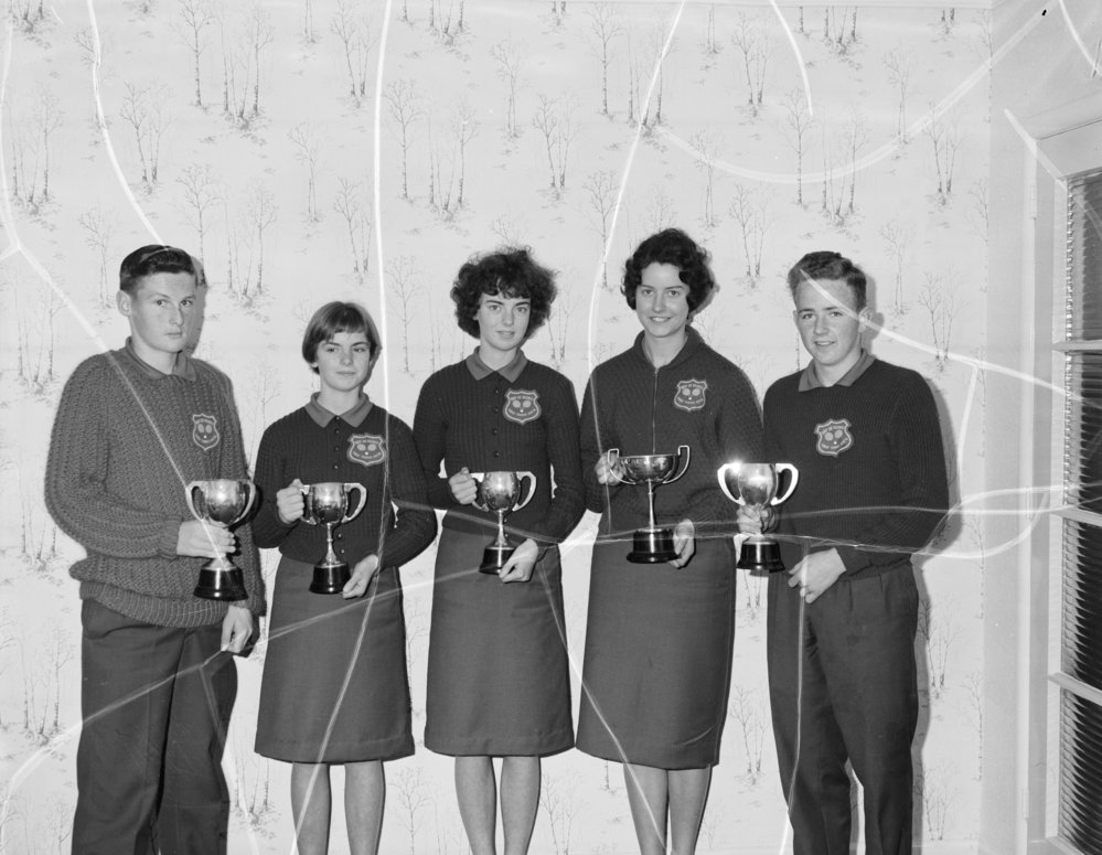 Date14 September 1961Reference NumberPhoto gcb-218DescriptionTable Tennis ChampsFormatNegativePhysical Description4x5″ cellulose triacetate black and white negativeSource of AcquisitionGifford-Cross Donation, 1992Photographer/CreatorBay of Plenty Times