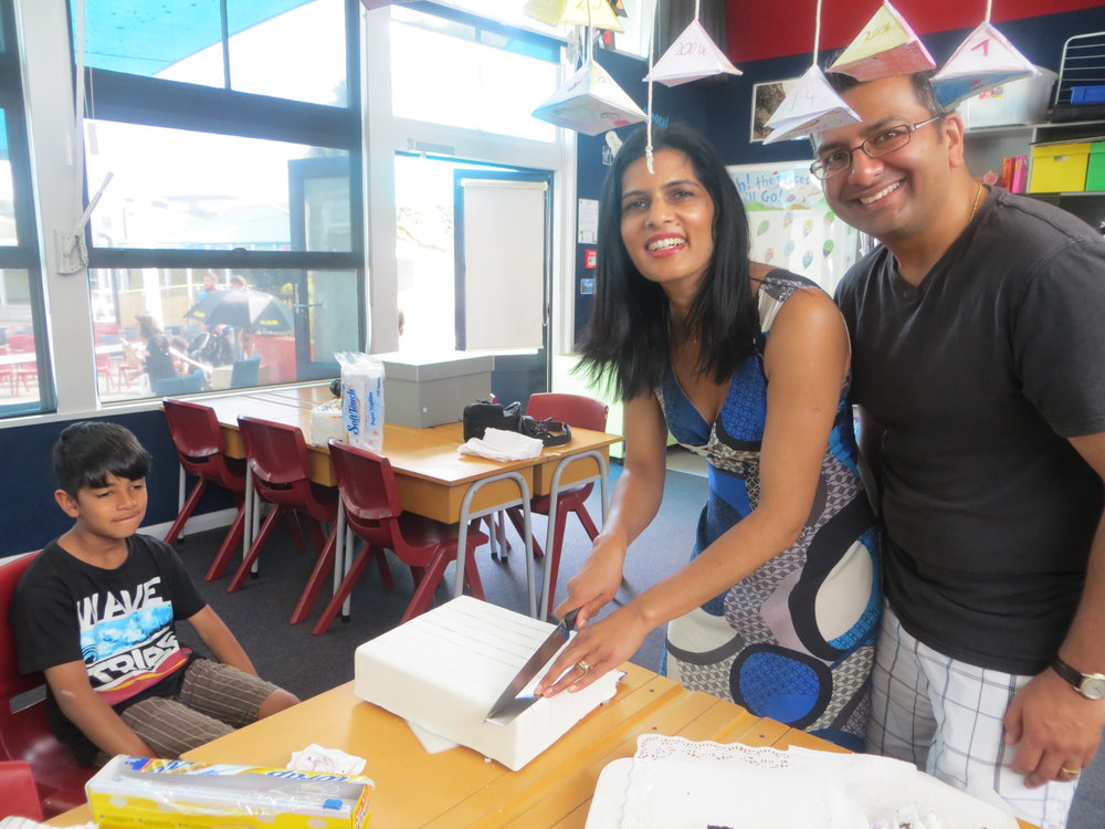 Raanik Patel (son) Pratima Patel (of Pretty Pink Cakes) Jitu Patel (husband) cutting the Centenary cake.