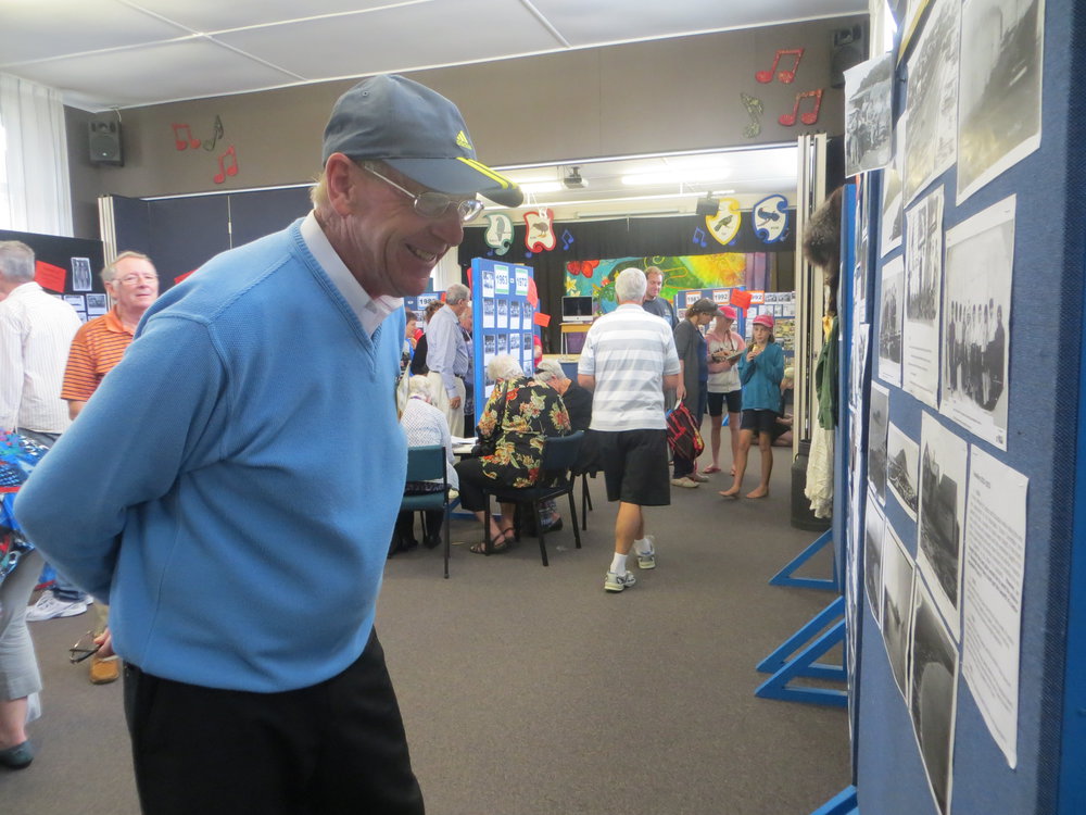 Harry Burggraaf looking at the decade displays of classes and the Mount area in the school hall.