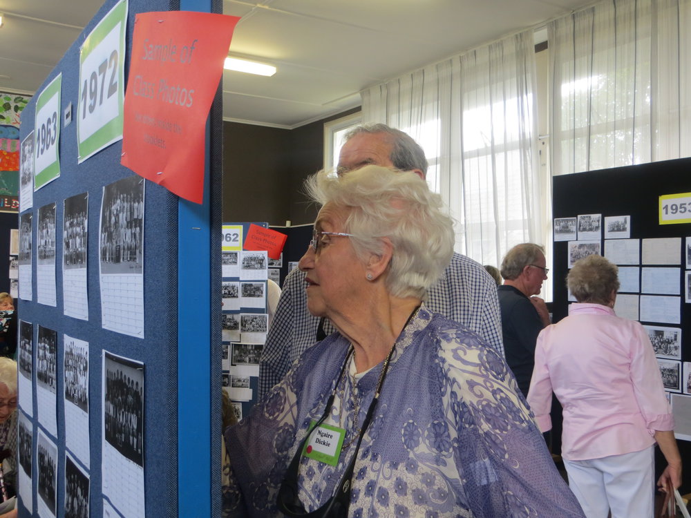 Ngaire Dickie (past teacher) with husband Blair Dickie in behind her looking at photo displays.