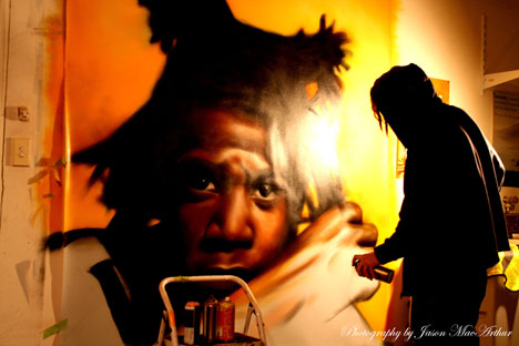 Owen Dippie painting the portrait of famous New York artist Basquiat. Based in Tauranga, Owen is one of New Zealand”s most internationally renowned street artists.