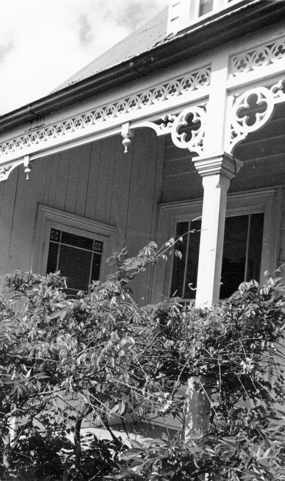 Reference NumberPhoto 03-263DescriptionTopcroft, 123 Edgecumbe Road, Tauranga, built for Samuel Clarke 1870. Details of ornate woodwork, western veranda. FormatPrintPhysical Descriptionblack and white printPhotographer/CreatorSyder, E.O.