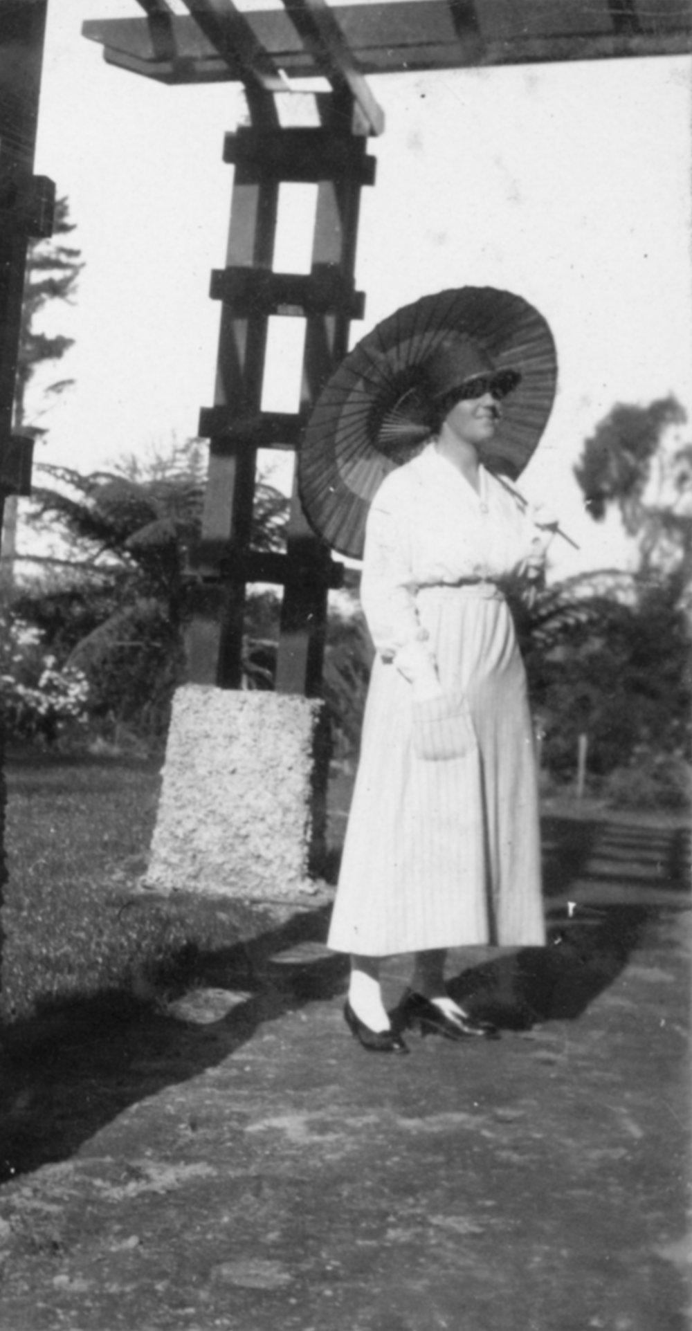 Date1910sReference NumberPhoto 03-393DescriptionLucy (Maltby) at The Oaks, with parasol. Tauranga, c 1910sFormatPrintPhysical Descriptionblack and white print