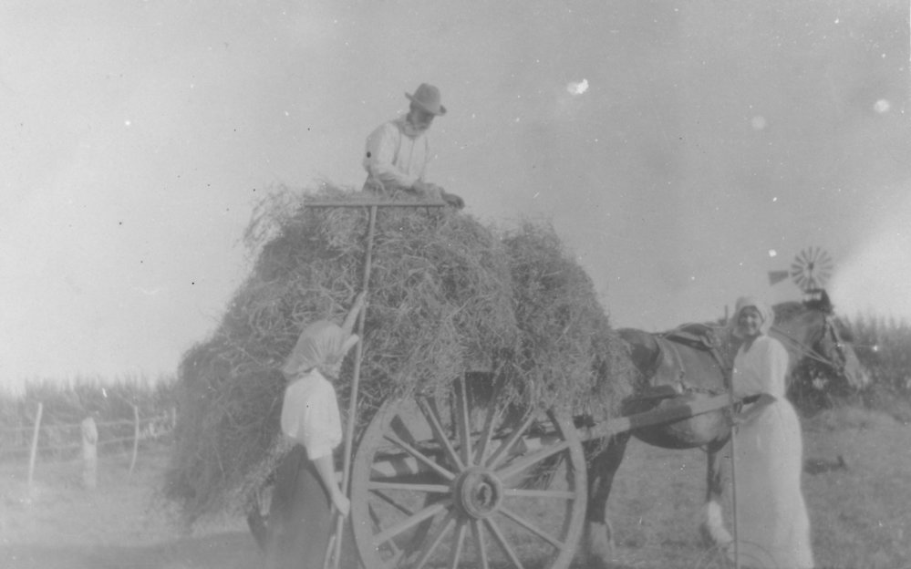 Date1910sReference NumberPhoto 03-433DescriptionHaymaking at Maungawhare (probably), Ōtūmoetai, c 1910sFormatPrintPhysical Descriptionblack and white print