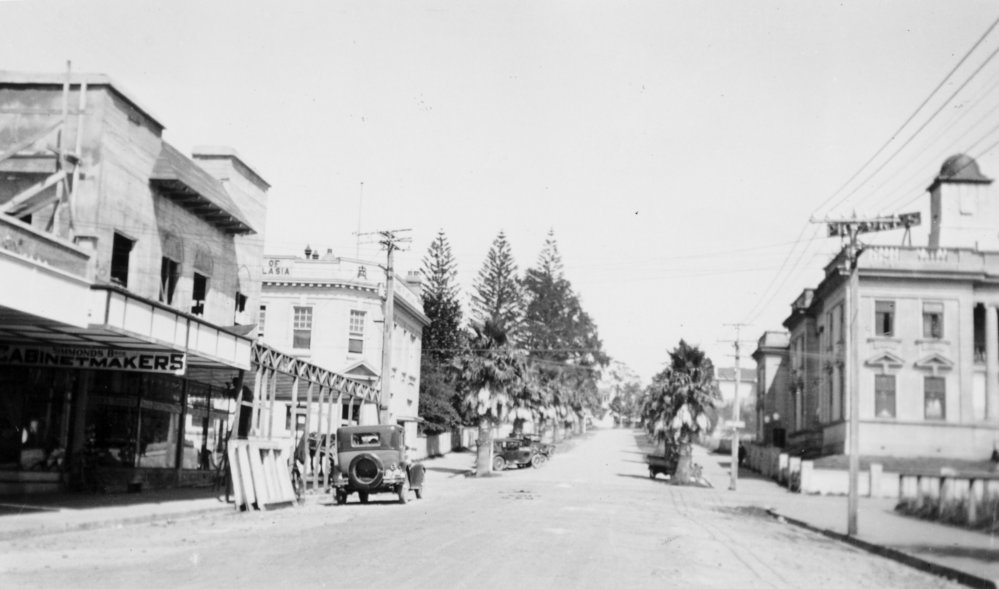 Reference NumberPhoto 03-523DescriptionWharf Street, Tauranga, showing Bank Chambers, Town Hall, and Bank of Australasia. FormatPrintPhysical Descriptionblack and white print