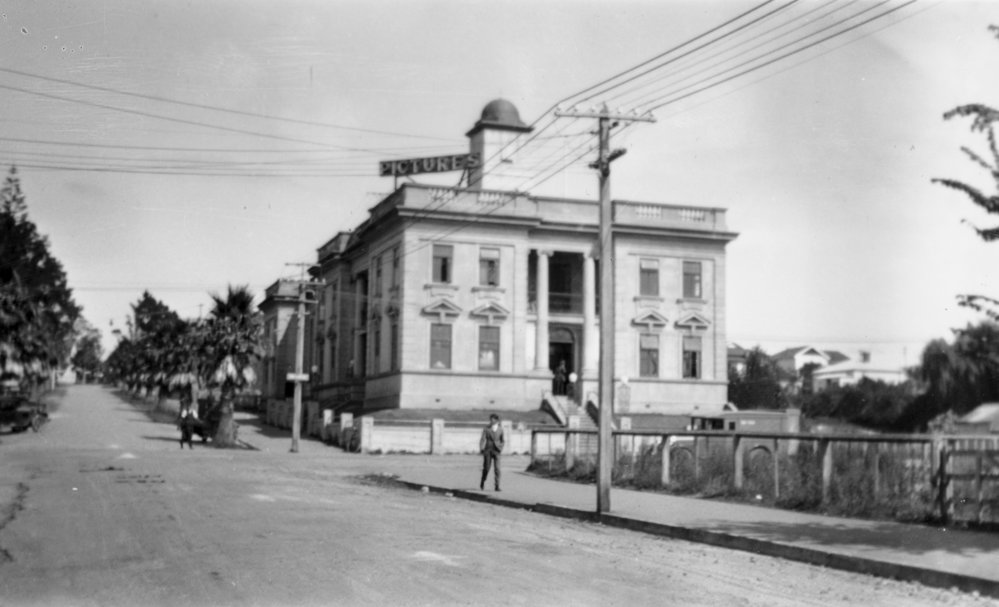 Reference NumberPhoto 03-528DescriptionTown Hall, Tauranga, corner Wharf and Willow Streets FormatPrintPhysical Descriptionblack and white print