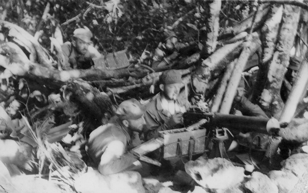 New Zealand soldiers with machine guns at Velalavela, Soloman Islands