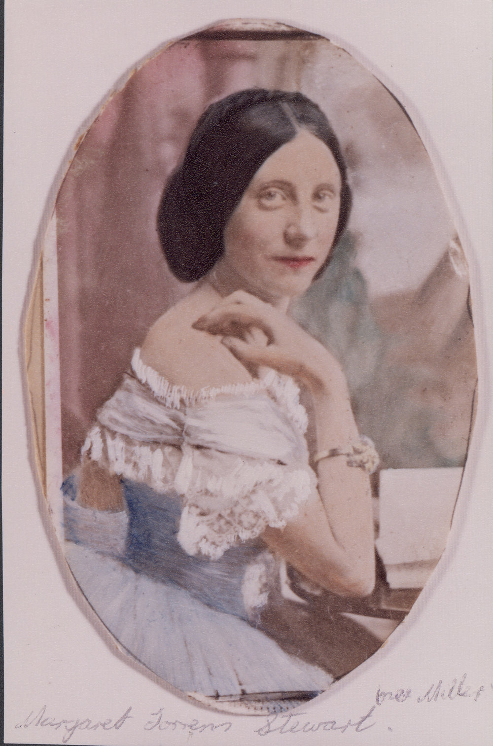 Date1860sReference NumberPhoto 04-095DescriptionMargaret Torrens Miller, wife of George Vesey Stewart (founder of Katikati settlement), c 1860s. Died on 28 July 1914, aged 81, in Ponsonby, Auckland. FormatPrintPhysical Descriptionhand coloured print