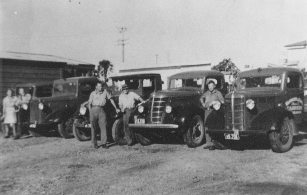 Date1940sReference NumberPhoto 02-244DescriptionHammond & Sons trucks, c1940sLeft to right: Eric Hammond, Russell Showman?, Dick Moyle, Bob Hammond, Bill GrahamFormatPrintPhysical Descriptionblack and white printPhotographer/CreatorMudford, Ken