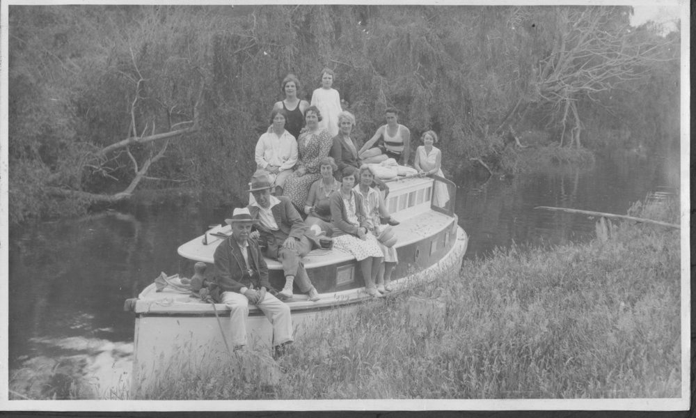 Date1920sReference NumberPhoto 02-340DescriptionImage from John Mowlem's album. John Mowlem and boating party in his boat the 'Virginia' on the Waimapū river, Tauranga, c. 1920s. FormatPrintPhysical Descriptionblack and white print