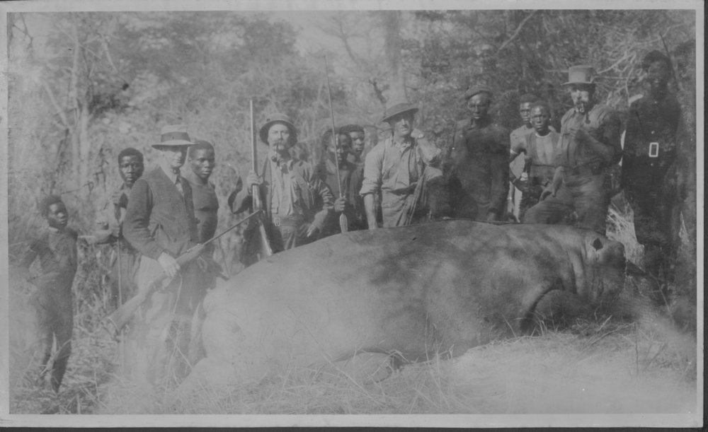 Reference NumberPhoto 02-397DescriptionImage from John Mowlem's album. Hunting party with dead hippoFormatPrintPhysical Descriptionblack and white print