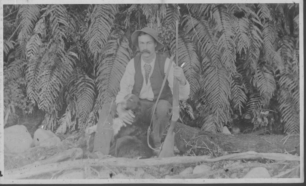 Reference NumberPhoto 02-440DescriptionImage from John Mowlem's album. Man with dog and gun, in front of ferns (mangemange)FormatPrintPhysical Descriptionblack and white print