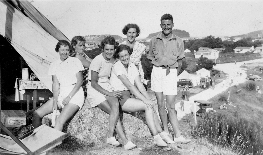 Date1930sReference NumberPhoto 03-027DescriptionFrom Kitty Hardy's album: "Xmas at the Mount", Mount Maunganui, 1930s (probably 1938). Kitty Hardy at rear, second from right. FormatPrintPhysical Descriptionblack and white print