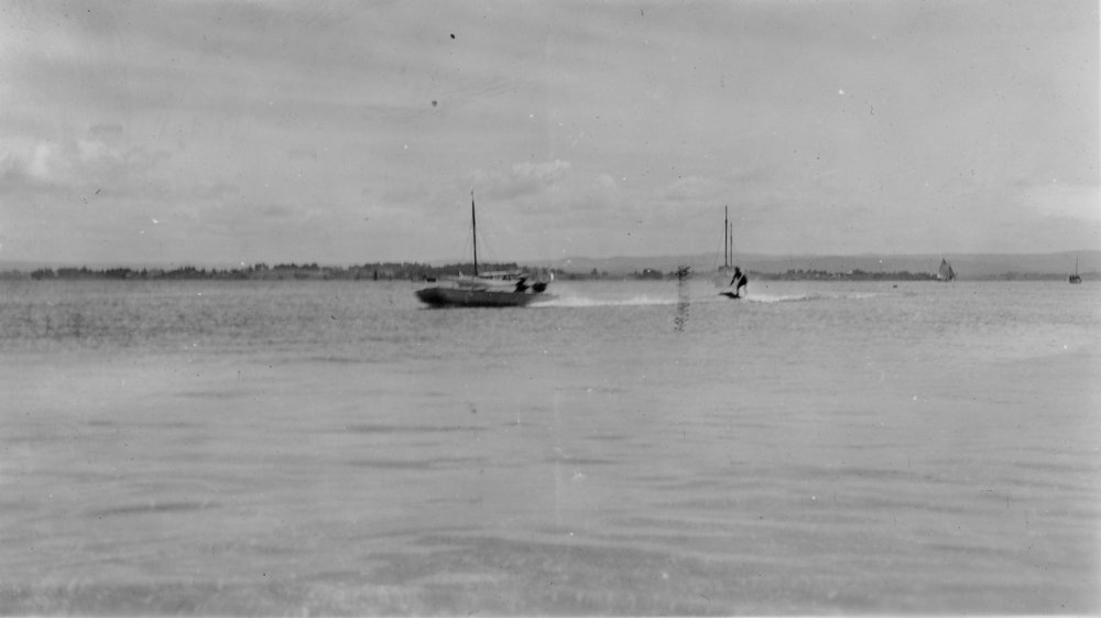 Date1930sReference NumberPhoto 03-031DescriptionFrom Kitty Hardy's album: "Aquaplaning on Tauranga harbour. " An early form of water skiing. 1930s. FormatPrintPhysical Descriptionblack and white print
