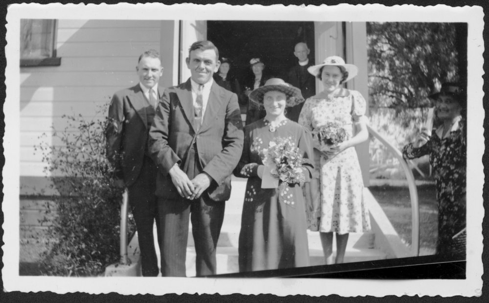 Date1940Reference NumberPhoto 03-045DescriptionWedding of Arthur David Padlie to Jean Alexander, 1940, Tauranga. Best man Tom Milne, bridesmaid - Herbert. FormatPrintPhysical Descriptionblack and white print