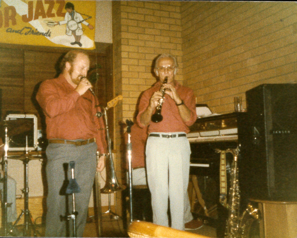 Date1984Reference NumberPhoto 12-534DescriptionPhotograph of two men on stage taken during the 22nd Tauranga National Jazz Festival, 1984. Written within album "Paul Saunders". 1984.FormatPrint
