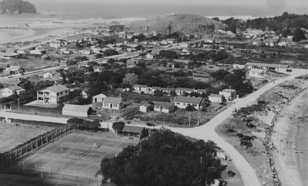 Date1930sReference NumberPhoto 01-654DescriptionView of Mount Maunganui showing the tennis courts and bowling green and Adams cottage, on Adams Avenue, and the dairy on The Mall. Cars parked on the shore of Waikorire (Pilot Bay) mid 1930s. No Norfolk Pines. The store has a surf Boards sign on roof.FormatPrintPhysical Descriptionblack and white print