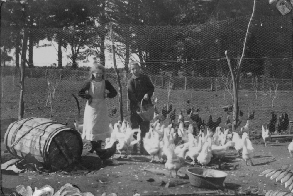 Datec. 1900Reference NumberPhoto 01-451DescriptionBerta and Willy feeding the hens, Katikati.