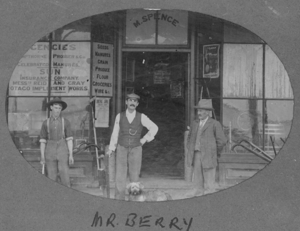 Datec. 1900Reference NumberPhoto 01-467DescriptionMr Berry outside Moses Spence's store, Tauranga, c1900.FormatPrintPhysical Descriptionblack and white print