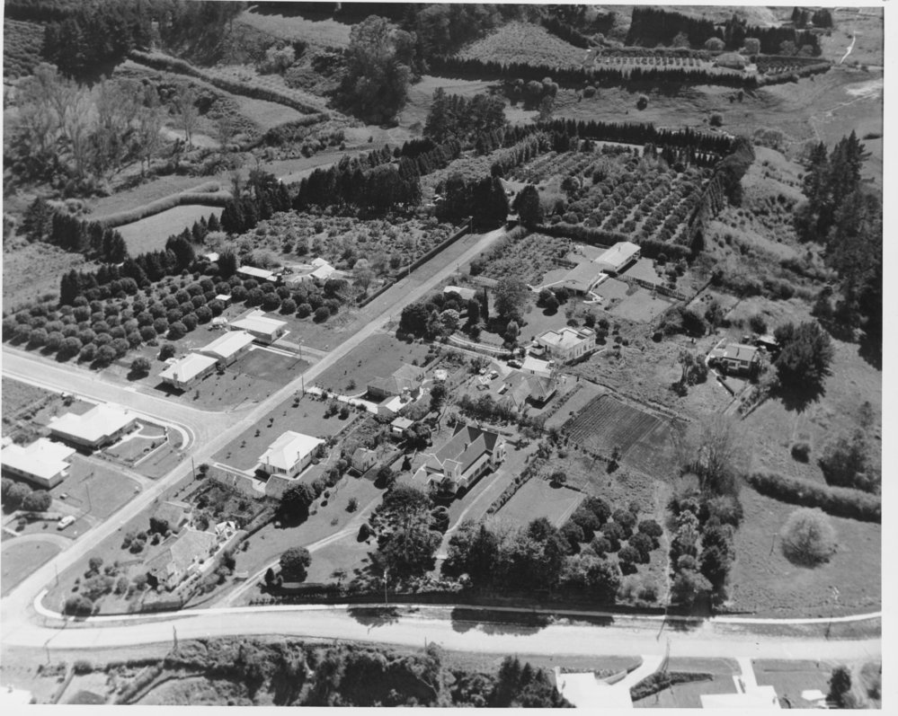 Datec. 1960sReference NumberPhoto 00-112DescriptionŌtūmoetai, Grange Road runs from left to right across the bottom of photo. Hillcrest Road runs from bottom left to the top. There is an orchard in the Mount View subdivision area. 'Woodhill', built in 1885 and now one of the city’s most historically significant buildings, is just below centre of photo, circa early 1960s. FormatPrintPhysical Descriptionblack and white printPhotographer/CreatorCarters Photo Service Tauranga