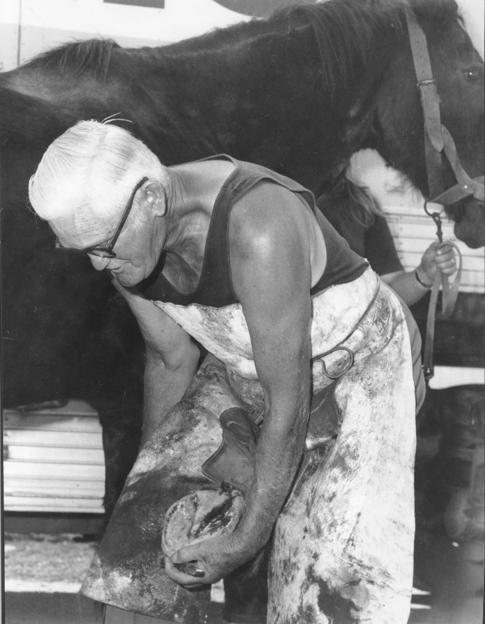 Date1978Reference NumberPhoto 02-095DescriptionCharlie Haua at the Blacksmith's shop, Tauranga Historic Village changing the shoe on one of the horse's hooves in 1978. Taken by Studio Vivian and FormatPrintPhysical Descriptionblack and white printSource of AcquisitionTed Morris Photographer/CreatorStudio Vivian