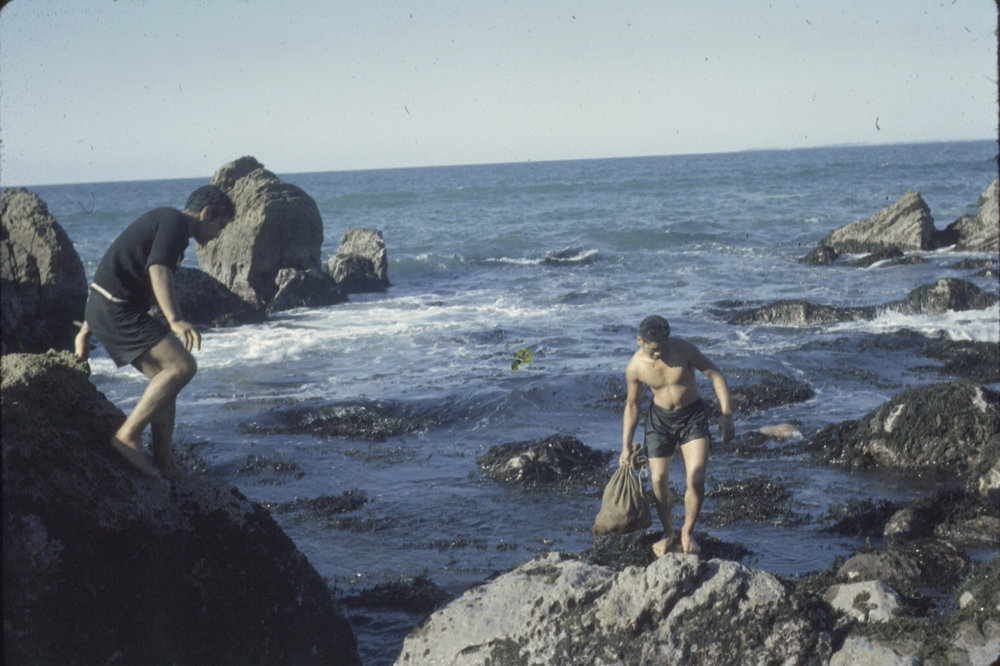 Datec. 1960sReference NumberPhoto 04-313DescriptionTwo men walking on rocks at Mount Maunganui, c1960s. One is carrying a sack of kina while the other is appears to be walking to meet up with the other. FormatPositivePhysical DescriptionSlideSource of AcquisitionS. Fraser