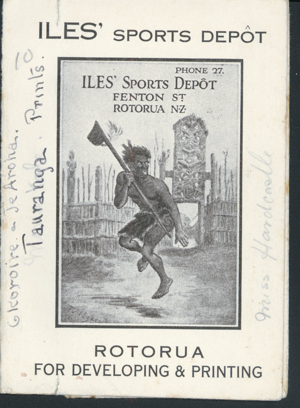 Datec. 1920sReference NumberPhoto 06-465DescriptionSketch of a Māori warrior performing either a haka or wero with a tewhatewha in his right hand outside the urunga (gateway) at Maketū by Major-General Horatio Gordon Robley. 1925. Photo folder, for Iles' Sport Depot, Fenton Street, Rotorua. This FormatPrintPhysical Descriptionblack and white printSource of AcquisitionOlive Smyth
