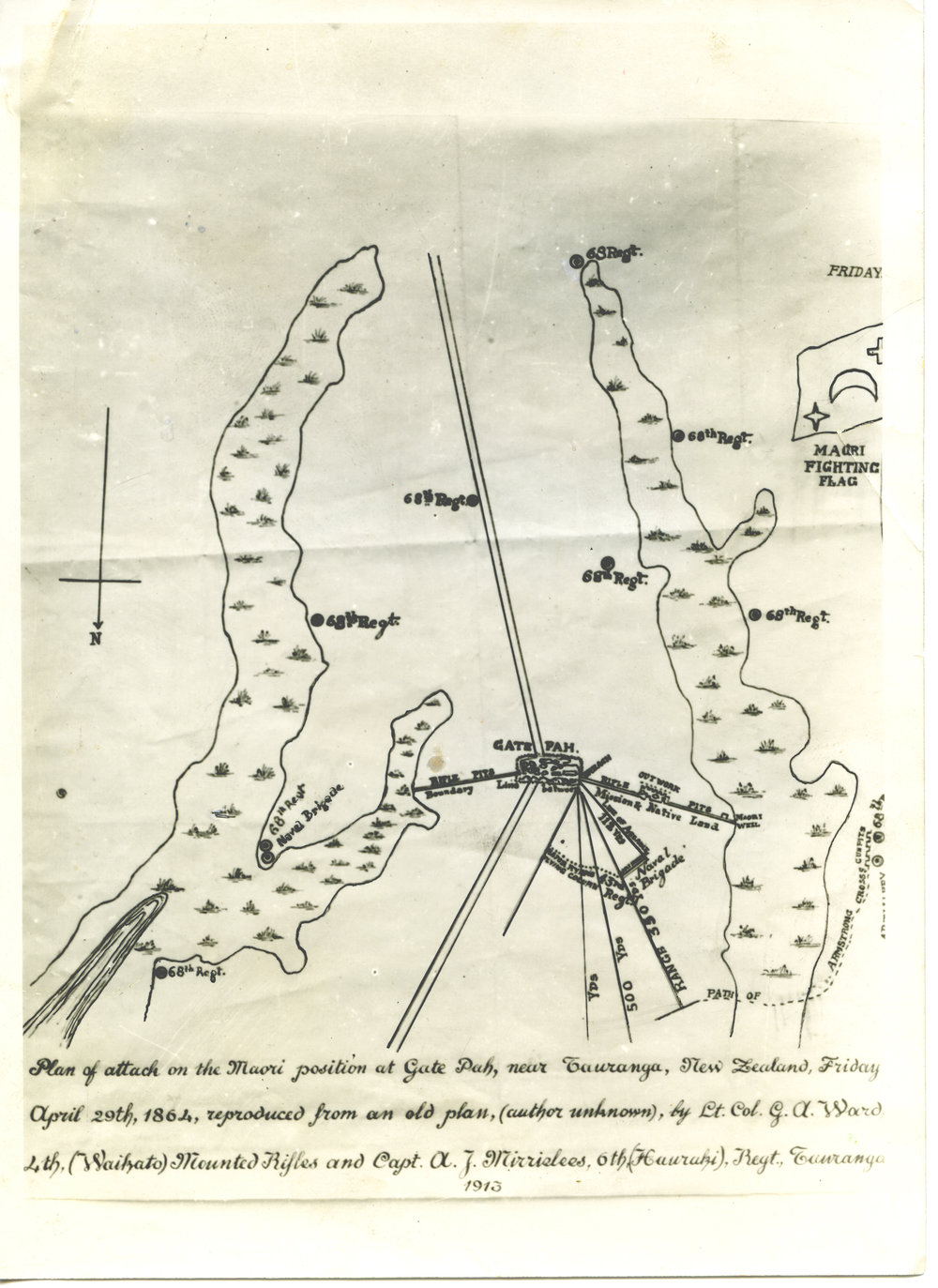 Date1864Reference NumberPhoto 08-027DescriptionCaption reads: "Plan of attack on the Māori position at Gate Pah, near Tauranga, New Zealand, Friday April 29th, 1864, reproduced from an old plan, (author unknown), by Lt. Col. G. A. Ward 4th (Waikato) Mounted Rifles and Capt. A. J. Mirrielees 6th (Hauraki), Regt. Tauranga 1913".
