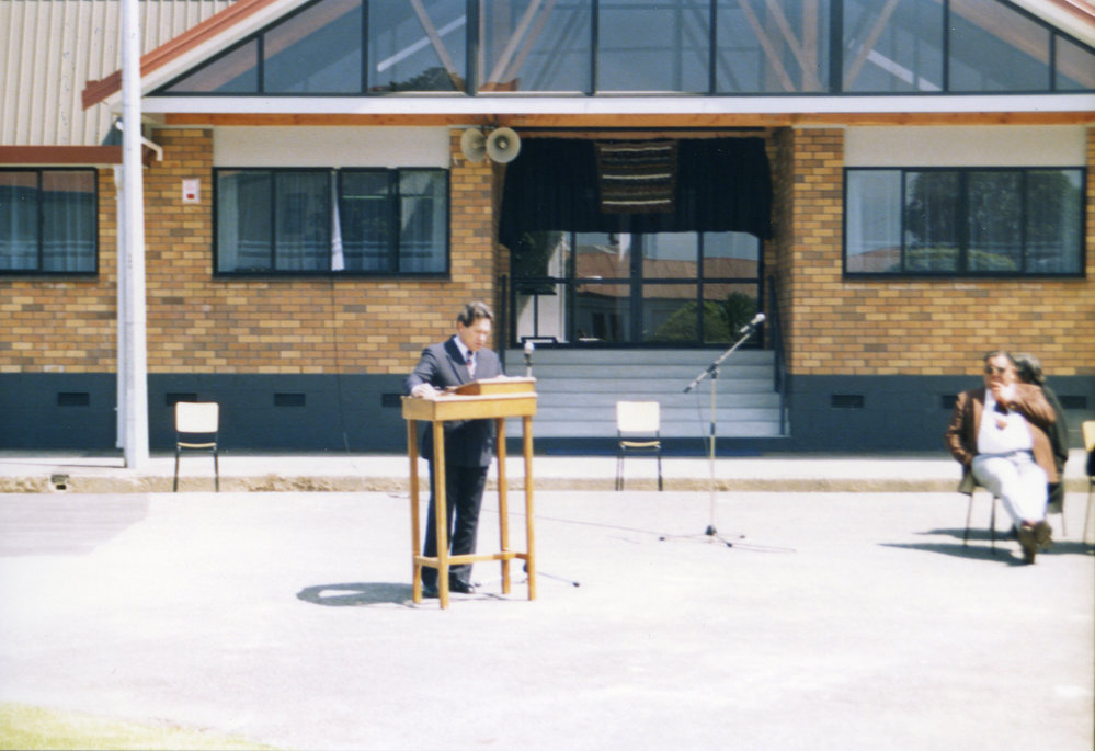 Date1991Reference NumberPhoto 09-012DescriptionOpening of the Tauranga Moana Māori Trust Board office, October 1991. Winston Peters MP for Tauranga speaking at the pulpit and Tipi Faulkner seated on right. FormatPrintPhysical Descriptioncoloured printSource of AcquisitionUnknown (Acc No 3351)