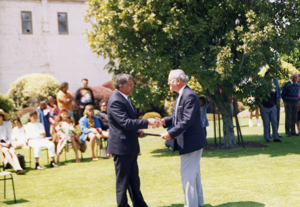 Date1991Reference NumberPhoto 09-019DescriptionOpening of Tauranga Moana Māori Trust Board office, October 1991. Left; Enoka Ngatai (TMMTB Chairman) shaking hands with Mayor Keith Clark, upon receiving a Robley painting as a taonga (gift). FormatPrintPhysical Descriptioncoloured printSource of AcquisitionUnknown (Acc No 3355)