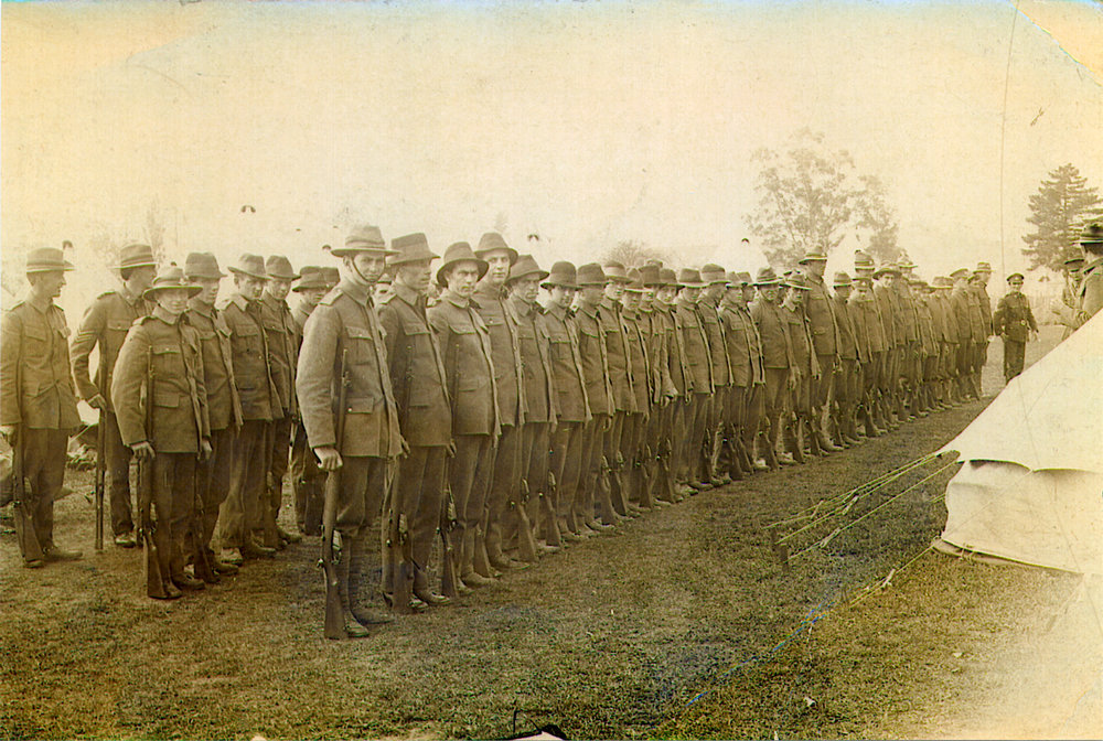 Datec. 1910sReference NumberPhoto 11-015Description Hauraki Regiment at camp in the Paeroa Domain, some time prior to World War I. Tom McCune, middle rank, extreme left, travelled by horse from his Whitianga home to Coromandel and then by boat to Paeroa to attend this camp. Original photograph donated to Hauraki Regiment by Tom W. McCune (62088 Private, WWII), 6/6 Kenneth Ave, Whitianga, in June 1998, via Ken Dalzell and Russell Skeet of Thames2011-003 HAU Hauraki Regiment CollectionFormatPrintPhysical Descriptioncopy printSource of AcquisitionThe 6th Battalion (Hauraki) Regimental Association Inc. History Room Curator, Tony Fraser.