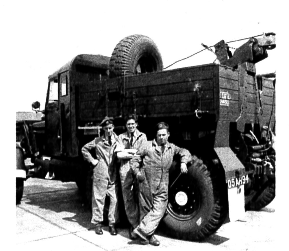Datec. 1956Reference NumberPhoto 12-233DescriptionPeter Curnow (centre) and other personnel based in the Royal Air Force Station Laarbruch. Behind them is a recovery truck used with downed aircraft for returning to the U. K. c1956. Part of Peter Curnow - Laarbruch collectionFormatPrintSource of AcquisitionPeter Curnow