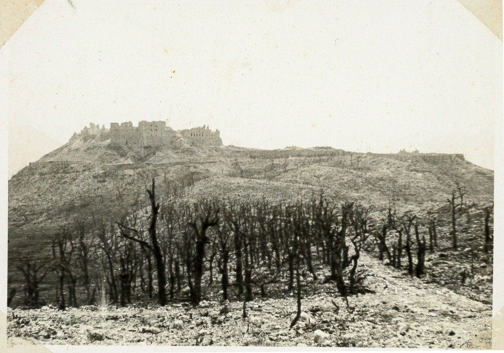 Date1944Reference NumberPhoto 12-379DescriptionSmall hilltop ruins, in a series depicting widespread destruction throughout Cassino. 1944. FormatPrintSource of AcquisitionThe 6th Battalion (Hauraki) Regimental Association Inc. History Room Curator, Tony Fraser.