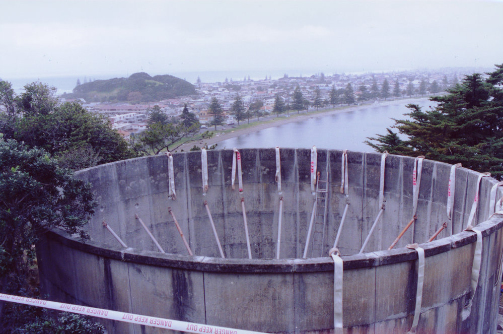 Date13 September 2004Reference NumberPhoto 05-152Description4008 gallon reservoir on Mauao, Mount Maunganui, just before its removal on 13 September 2004. It was no longer in use from c. 1960. It was built in c. 1886, by Captain Best for local steamers and coastal craft. (Bay of Plenty Times, 15 Feb 1887.) Initiated by Mr Bodell and agreed to by the Government. Cement was sent up by the Stella. Mr Bodell contributed an expensive tap.FormatPrintPhysical Descriptioncoloured print