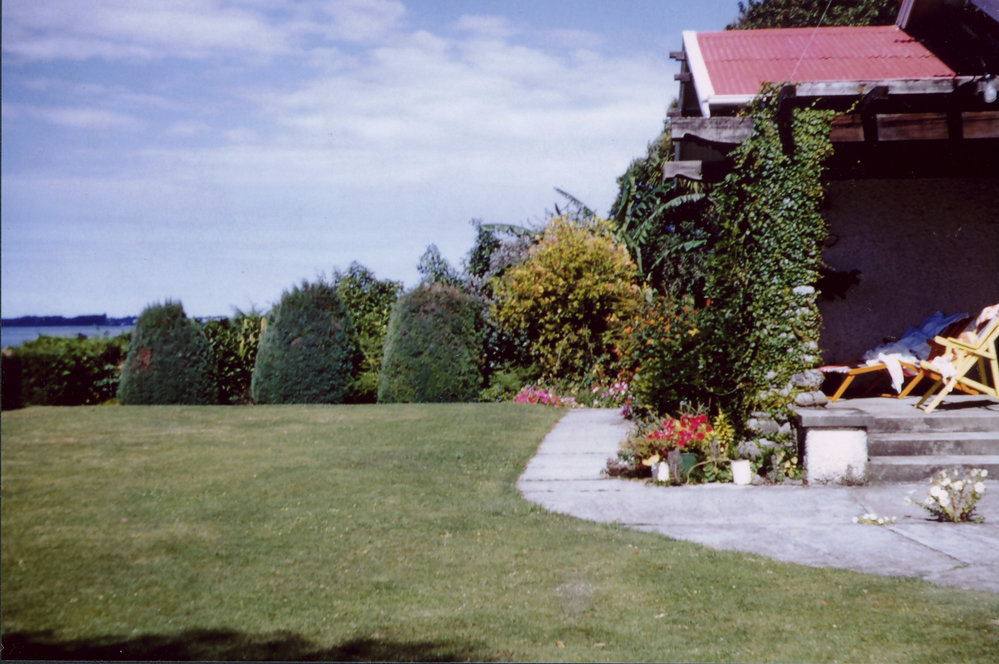 Datec. 1960Reference NumberPhoto 05-210DescriptionIn the garden at Fairview, the Mathesons' farm on the Ōtūmoetai Pā site. Shows the front porch with deckchairs, and the lawn overlooking the sea.FormatPrintPhysical Descriptioncoloured print