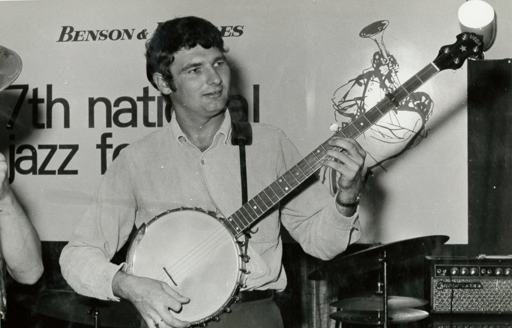 Date1969Reference NumberPhoto 12-463DescriptionA man playing an instrument taken during the 7th National Jazz Festival, 1969. Written within album "Brian Borlund 1969 (7th)". 1969. FormatPrintSource of AcquisitionTauranga Jazz Society