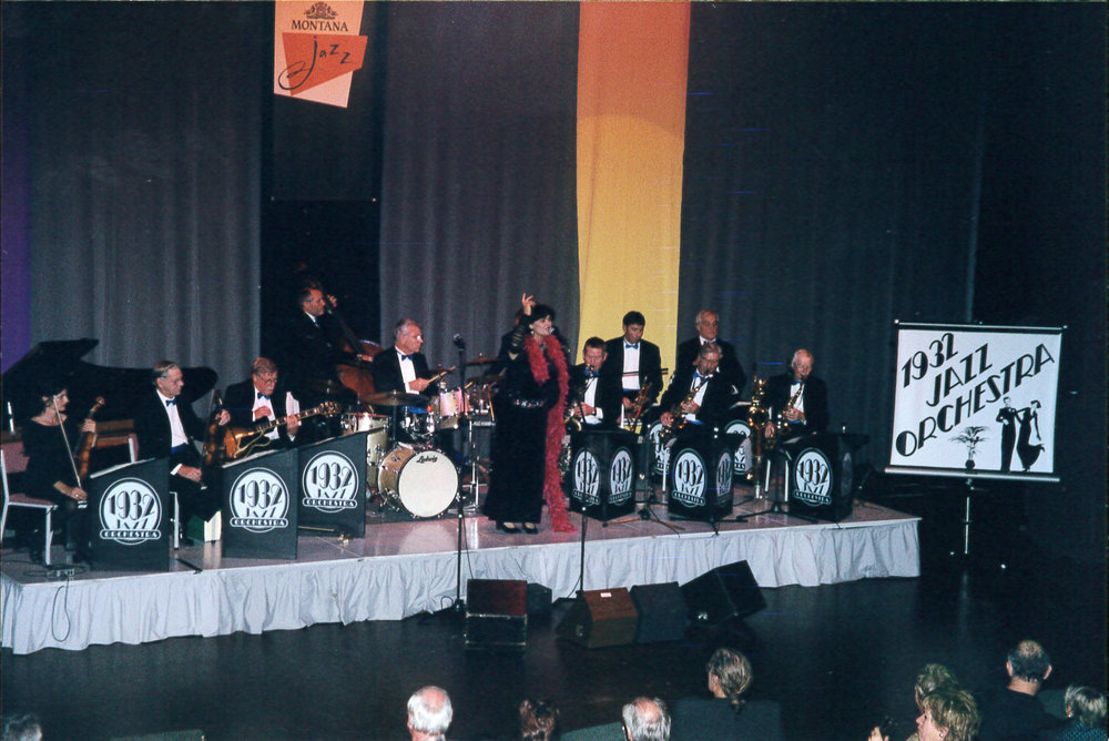 Date2001Reference NumberPhoto 12-485DescriptionAn orchestra on stage. 39th Jazz Festival Band with Marion Arts (vocals). 39th Tauranga National Jazz Festival, 2001.