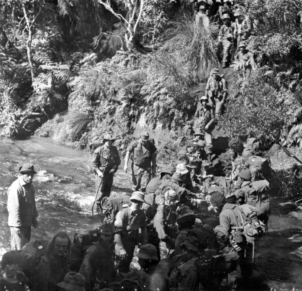 Date1979Reference NumberPhoto 12-778DescriptionRiver crossing on foot taken during Recruiting Weekend 1979. FormatPrintSource of AcquisitionThe 6th Battalion (Hauraki) Regimental Association Inc. History Room Curator, Tony Fraser.