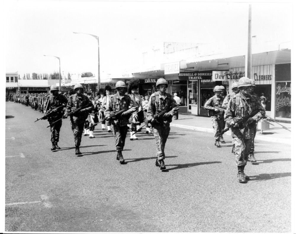 Date1982Reference NumberPhoto 13-357DescriptionSoldiers and pipers marching in the street. Noted with file 'Tokoroa 1982. The March Past. Fixed Bayonets, Flags flying. Spearhead formation, Point Platoon C (Tokoroa) Coy. lead the Parade, followed by the Pipes and Drums 6Bn (Hau) led by Drum Major Peter McFarlane. ' Stamped on reverse 'Tokoroa Publishing Co. Ltd. ' 1982. FormatPrintSource of AcquisitionThe 6th Battalion (Hauraki) Regimental Association Inc. History Room Curator, Tony Fraser.